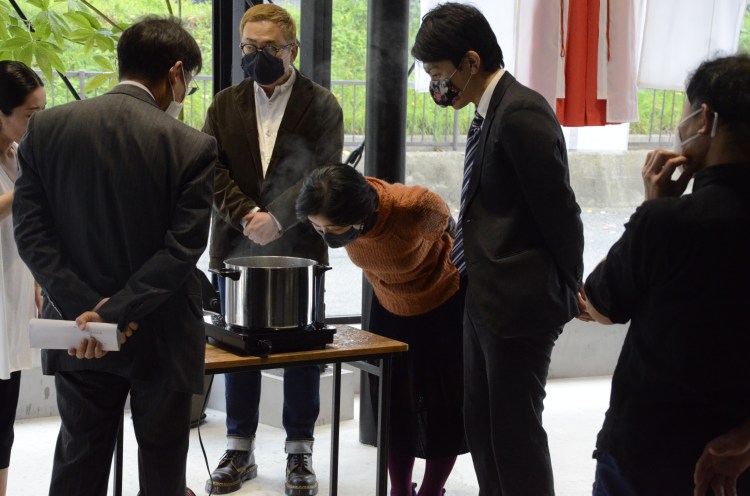 水を起点にしたキッカケは、コロナの影響で息の飛散シュミレーションの図を毎日のようにTVやネットで見る生活が続き、可視化された息の飛沫がグロテスクだと感じたからでした。ウイルスという普段は見えないものが可視化されたことで、飛沫に対する恐れや、他人と時間と空間を共にすることへの不安が生まれてきて、心が傷付き、孤独感を抱えるようになりました。今もその状況が続いています。その反対のことをしてみたかった。浴びてもいい飛沫、湯立神楽の湯のしぶきを振りまいてYUDATE-19に感染させてみようと思いついたことがはじまりです。