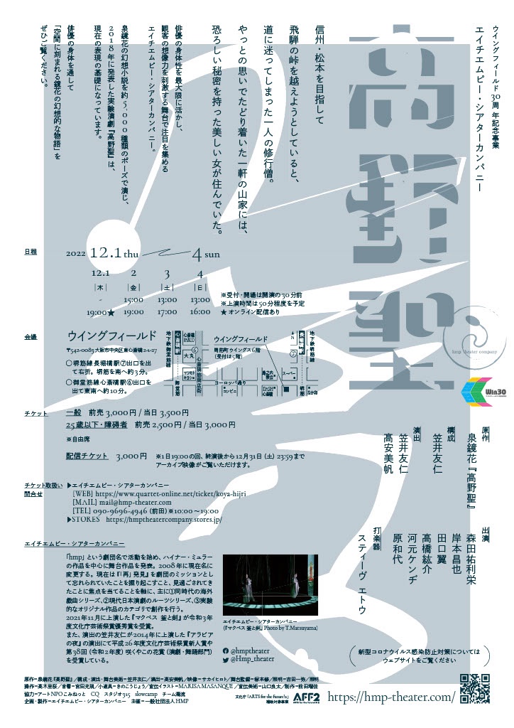 俳優の身体性を最大限に活かし、観客の想像力を刺激する舞台で注目を集めるエイチエムピー・シアターカンパニー。 泉鏡花の幻想小説を約5,000種類のポーズで演じ、2018年に発表した実験演劇『高野聖』は、現在の表現の基礎になっています。 俳優の身体を通して「空間に刻まれる鏡花の幻想的な物語」をぜひご覧ください。