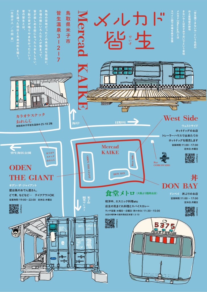 ■メルカド皆生とは■「皆生横丁きないや」という名前のお土産物屋の跡地。きないやとは米子弁でおいでという意味。メルカドとはスペイン語で市場を表す言葉(Mercad)。角地の空地だったこの未完成な空間に、市場の様にいろんな人が集まって、皆が楽しめる街になったらおもしろい。下駄の音が鳴りやまなかったという昔の皆生とは、また違った明日と未来の形を描く。仕掛け人 小田 史