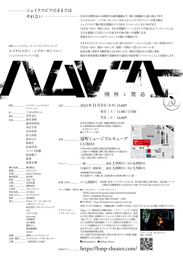 日本の古典作品から同時代の海外戯曲まで、様々な戯曲の上演に挑んできたエイチエムピー・シアターカンパニーがおくるシェイクスピアシリーズ第3弾は、シェイクスピア劇の四大悲劇の1つである『ハムレット』をとりあげます。「生きるべきか、死ぬべきか、それが問題だ―」のセリフで知られる『ハムレット』は、父王を毒殺して王位についた叔父や不貞の母への復讐に生き、苦悩するデンマーク王子ハムレットを描いた物語です。そもそもどうしてハムレットはこんなに苦しむのか? ハムレットとはいったい何者なのか?「生きるべきか、死ぬべきか」の二者択一の問いに苦しむハムレットを、社会を鋭く考察する劇作家くるみざわしんが、現代の視点から大胆に改作。独自の身体表現と実験的で洗練された演出でHMP版『ハムレット』としてお届けします。