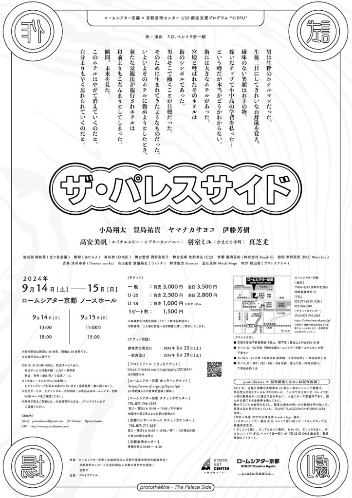 出演します。プロトテアトルさん、はじめてです。初共演の方ばかりで緊張しますが、心新たに向き合ってみたいと思います。ペレイラくんの4年ぶり長編、新作「ザ・パレスサイド」只今、お稽古中ですが面白いですよ。ぜひ、よろしくお願いします。