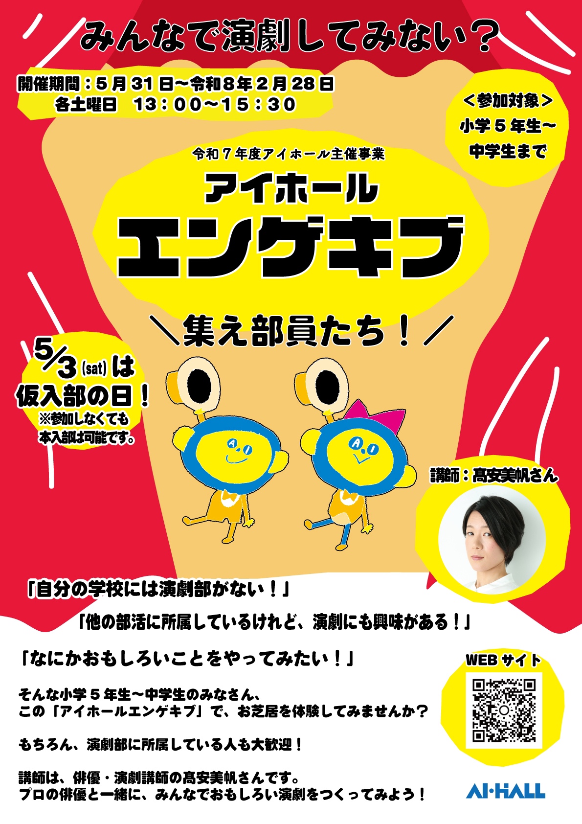 「自分の学校には演劇部がない!」「他の部活に所属しているけれど、演劇にちょっと興味がある!」「なにかおもしろいことをやってみたい!」そんなみなさん、この「アイホールエンゲキブ」で、お芝居を体験してみませんか?もちろん、演劇部に所属している人も大歓迎!