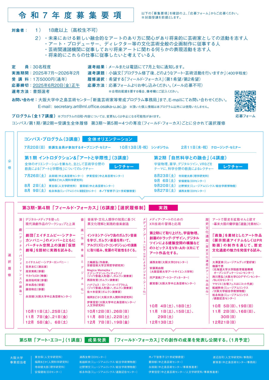 大阪大学中之島芸術センターでは、大阪大学の多様な学問領域を横断的に取り入れる新しい芸術を創出すべく、社会人芸術家育成プログラムを始めます。芸術文化への深い理解を備え、最新の学問との学際的な融合を実現する力を持ち、複雑化する社会課題に取り組める芸術家の育成を目指します。