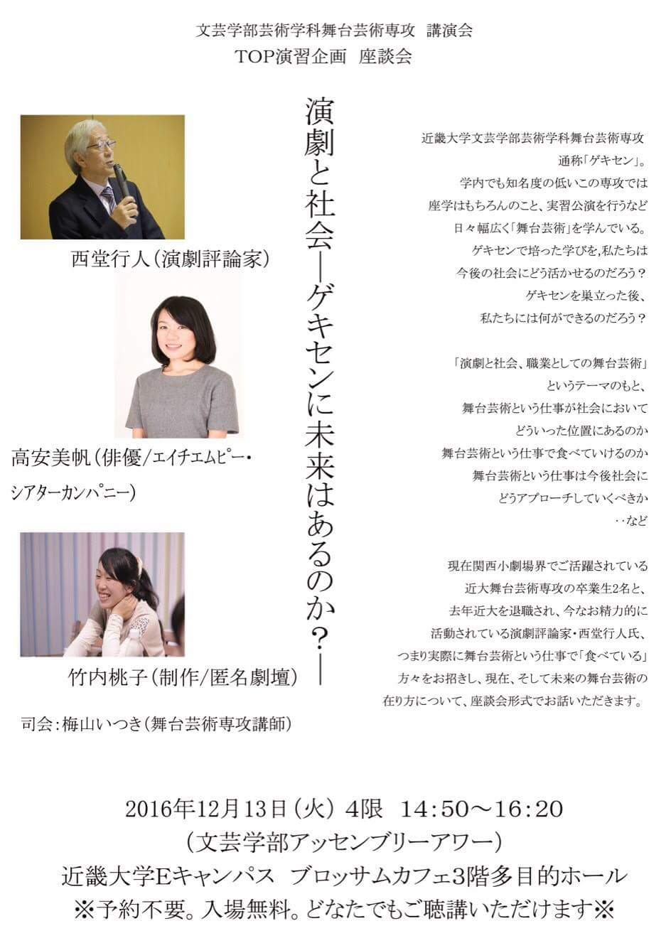 「演劇と社会、職業としての舞台芸術」というテーマのもと、 舞台芸術という仕事が社会においてどういった位置にあるのか、 舞台芸術という仕事で食べていけるのか、 舞台芸術という仕事は今後社会にどうアプローチしていくべきか…など。現在、関西小劇場界でご活躍されている近大舞台芸術専攻の卒業生2名と、去年近大を 退職され、今なお精力的に活動されている演劇評論家・西堂行人氏、つまり実際に舞台芸術という仕事で「食べている」方々をお招きし、 現在、そして未来の舞台芸術の在り方について、座談会形式でお話しいただきます。